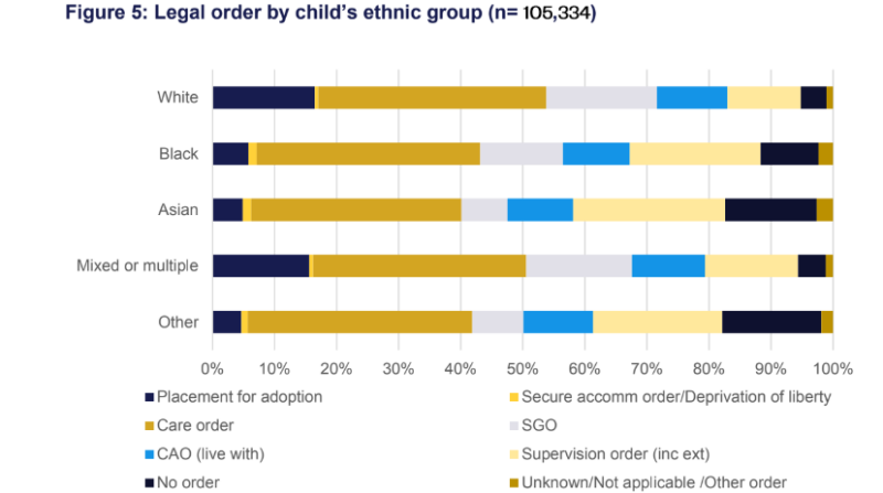 - In terms of legal orders, the analysis shows Black and Asian children are less likely to be on an adoption/placement order than children who are from White and Mixed or multiple ethnic groups. While this is not a novel finding, our analysis shows that it cannot be explained by ethnic differences in age, location, nor being part of a sibling group in proceedings.