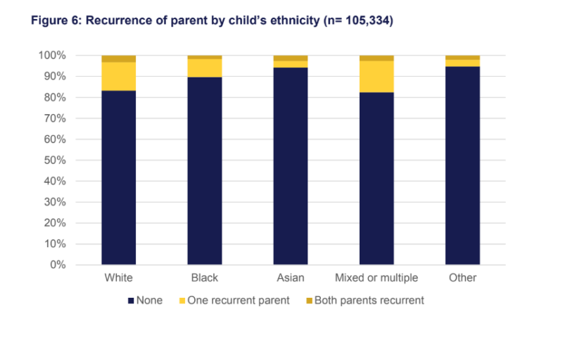 Figure 6 shows a higher proportion of children from White and Mixed or multiple ethnic groups had at least one recurrent parent than children in all other ethnic categories. In the case of children from White and Mixed or multiple ethnic groups, 17% had at least one recurrent parent compared to 10% of Black children and 6% of Asian children. The data does not enable us to say whether this is simply because these groups have fewer children, and so have less chance to recur, or whether outcomes for parents of children in these ethnic groups are better.