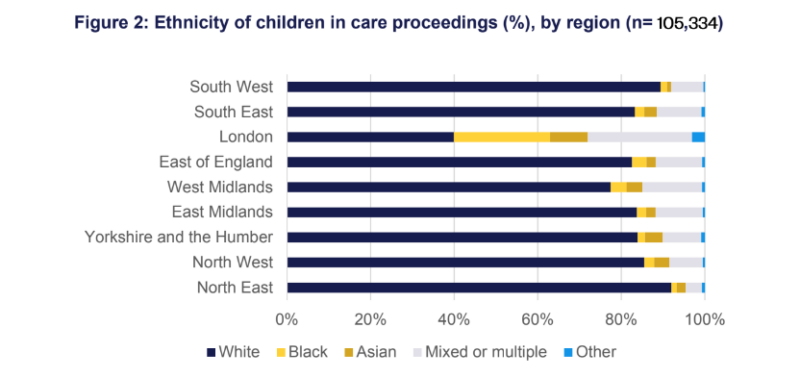 The data shows that UK regions vary widely in terms of ethnic composition of children in care proceedings. As shown in Figure 2, London is very ethnically diverse compared to other regions, with 60% of children in public law proceedings coming from minoritised ethnic groups.The North East is the least ethnically diverse, with 92% of care proceedings involving White children.