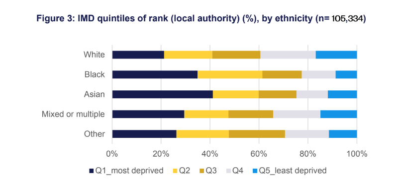 This has important practical implications. Given that children of all ethnicities are living in similarly deprived, small neighbourhoods but Black children live in less affluent authorities, this raises the question of whether there are differences in the provision of services that these families have access to. Do more affluent local authorities have more resources/services to support these children? And if within a local authority there are many deprived neighbourhoods then there may be greater demand leading to increased pressure on resources. This may make a difference to the services that children and parents receive.