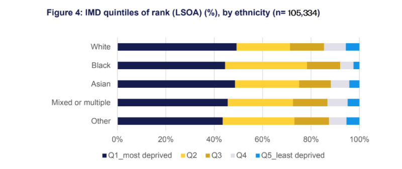 However, when looking at deprivation levels at the more granular LSOA level (see Figure 4), the gap closes. In fact, now White children are the most likely to live in the most deprived small neighbourhoods at 46% – not dissimilar to the percentage of Asian, Black and Mixed or multiple ethnic groups. This implies that children are living in quite similarly deprived, small neighbourhoods – but White children are more likely to live in deprived neighbourhoods within a more affluent local authority.